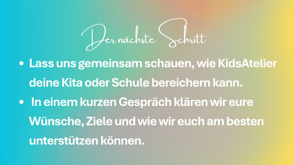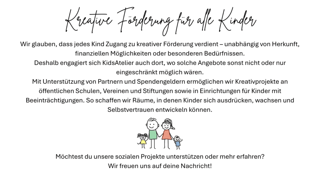 Alles begann im gemeinschaftlich genutzten Atelier. Schon bald durfte ich mit Kitas und Schulen zusammenarbeiten und habe nach und nach ein tolles Team aus qualifizierten Fachkräften aufgebaut, das mit mir zusammen das KidsAtelier-Konzept umsetzt. Heute profitieren immer mehr Kinder von unserer kreativen Magie, erleben Momente voller Neugier, Lachen und Ideenreichtum – und wir lieben es, sie auf diesem spannenden Weg zu begleiten.